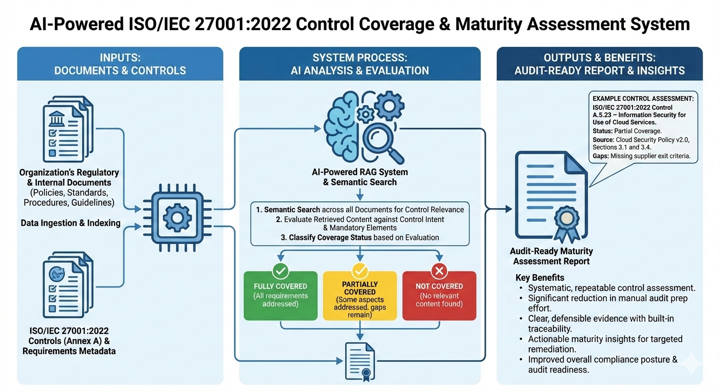 An Information Security Manager is preparing for an ISO/IEC 27001 certification audit and need to determine to what extent the existing regulatory and internal policy documents cover each ISO/IEC 27001:2022 control. For every control, it should be identified whether the control it is fully covered, partially covered, or not covered. The system should generate an audit-ready maturity assessment report.